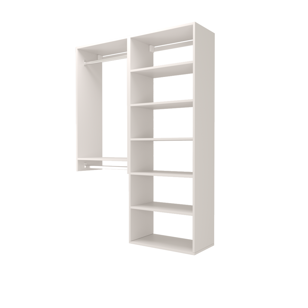 The Wall-Mounted Levio Closet Design 2 offers a smart and elegant way to organize your reach-in closet. This wall-hung configuration is crafted to make the most of your space, featuring dual hanging sections for shirts, jackets, and pants. Adjustable shelves provide flexible storage for folded items, shoes, and accessories, ensuring everything stays tidy and easy to access. With its neutral modern finish, this modular closet blends effortlessly with any interior style. Designed for durability, quick installation, and long-term performance, it’s the perfect customizable wall-mounted closet system for those who value both functionality and timeless design.