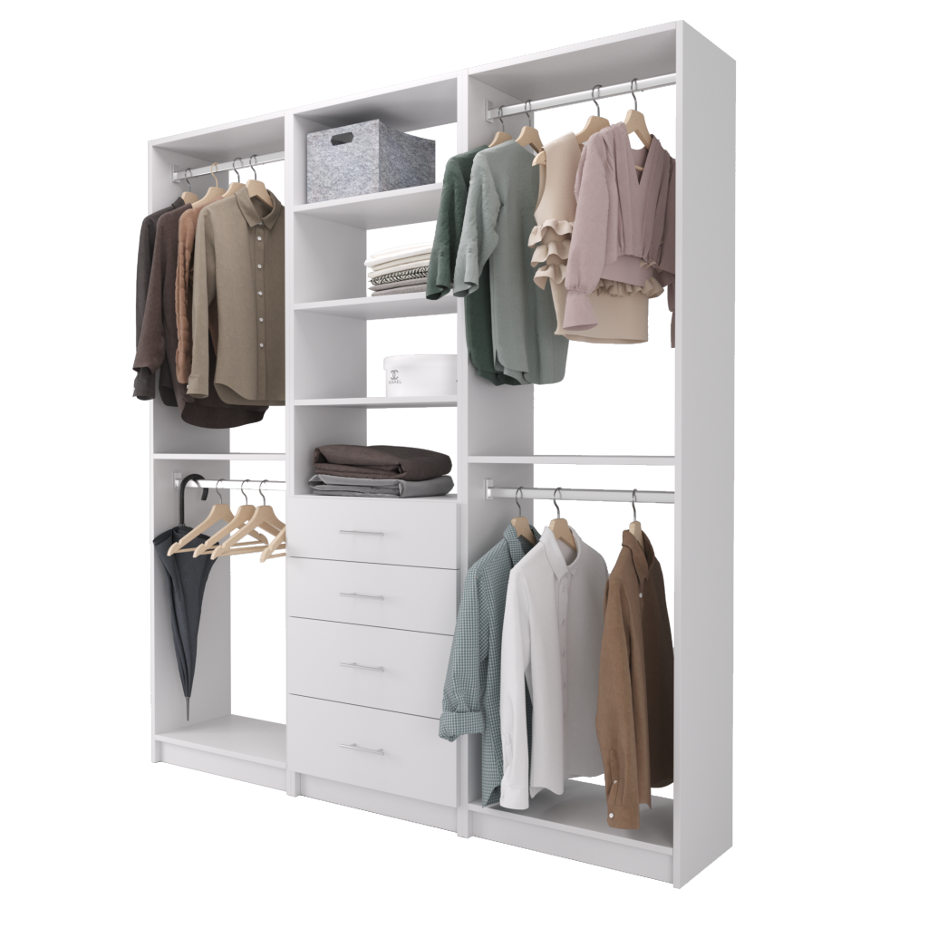 The Nexus Closet Design 1 is a floor-based closet system thoughtfully designed to maximize both storage and style in your reach-in space. It features double hanging sections for shirts and pants. Four spacious drawers provide convenient concealed storage for folded clothes, accessories, and personal items, keeping your space organized and clutter-free. Adjustable shelving offers flexible storage options for shoes or décor, allowing easy customization to fit your needs. With its clean, neutral finish and modern lines, this floor-mounted closet organizer complements any interior style. Built for durability, simple installation, and lasting elegance, it delivers a professional, built-in look that enhances everyday living.