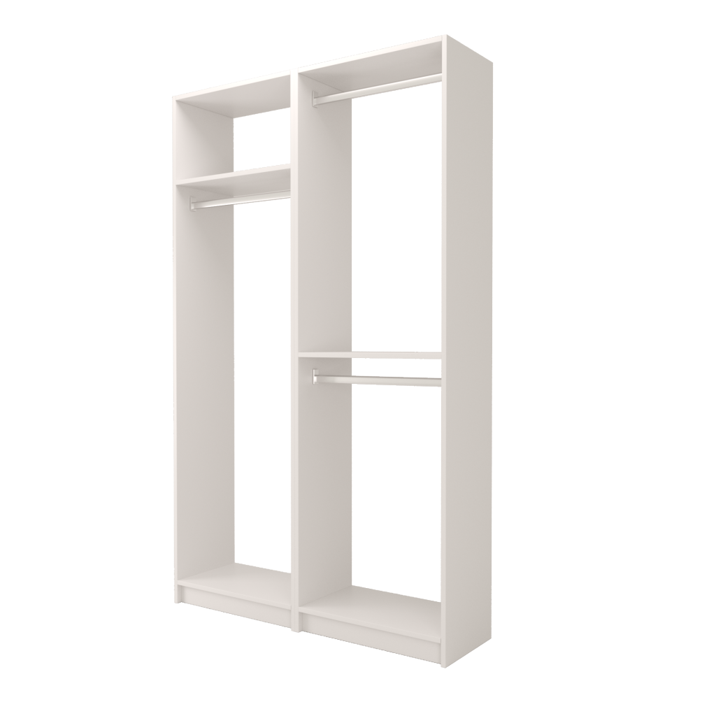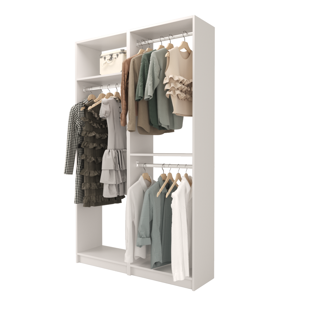 The Nexus Closet Design 6 is a floor-based modular closet system that combines smart organization with timeless design. It features double hanging sections designed to hold shirts, blouses, and pants efficiently, maximizing vertical space while keeping garments neatly separated. A dedicated long hanging area provides ample room for dresses, coats, and other full-length clothing, ensuring everything has its place. With its neutral, contemporary finish and sturdy floor-based structure, this custom closet system blends seamlessly with any décor while offering durability, convenience, and a clean, built-in look.
